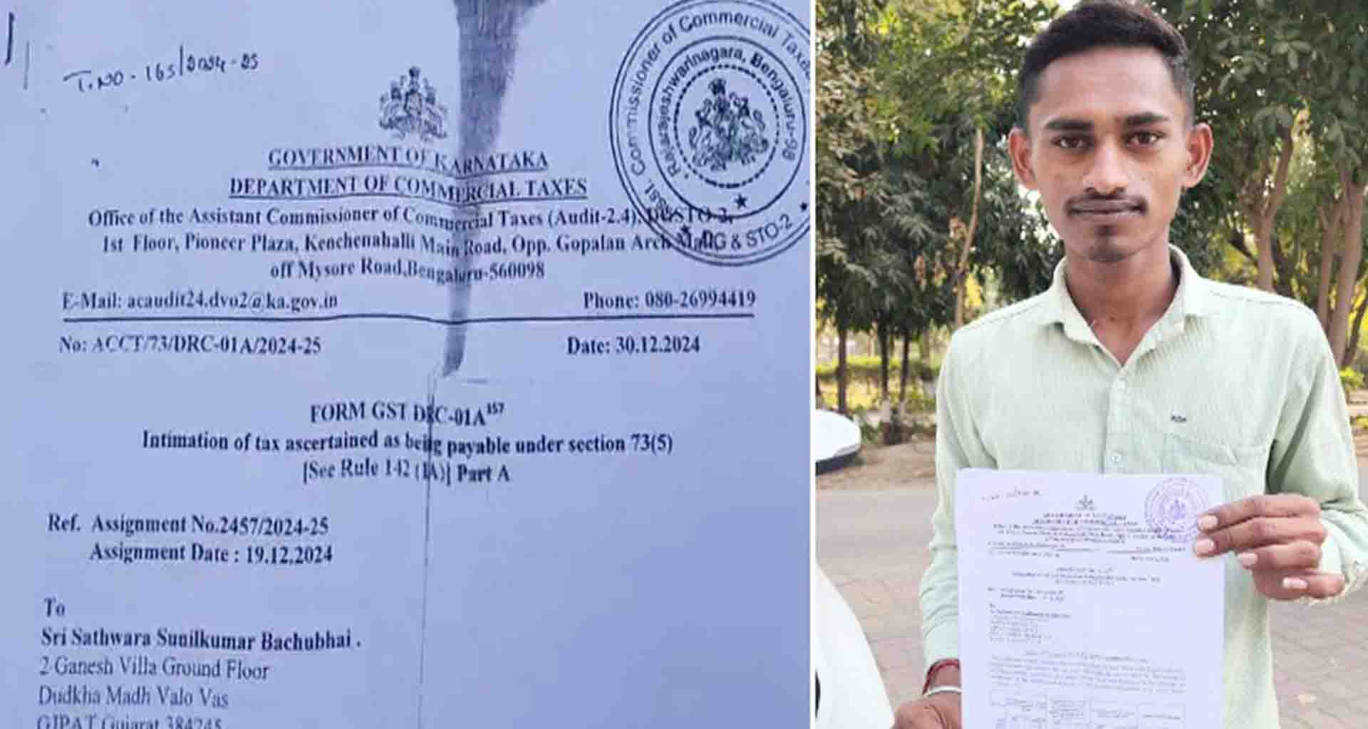 સામાન્ય પરિવારના યુવાનેવકીલ ની સલાહ મુજબ સાયબર ક્રાઈમ અને ગૃહ મંત્રાલય ને ફરિયાદ કરી:પાટણના સમી તાલુકાના દુદખા ગામના સામાન્ય પરિવારના યુવક સુનીલ સથવારાને બેંગલુરુ GST વિભાગ તરફથી 1.96 કરોડ રૂપિયાનો ટેક્સ ભરવાની નોટિસ મળતા ખળભળાટ મચી ગયો છે. આ નોટિસ માં જણાવવામાં આવ્યું છે કે યુવકના નામે દેશના વિવિધ રાજ્યોમાં 11 થી વધુ પેઢીઓ ચલાવવામાં આવી રહી છે, જેમાં કરોડોનું ટર્નઓવર નોંધાયું છે.