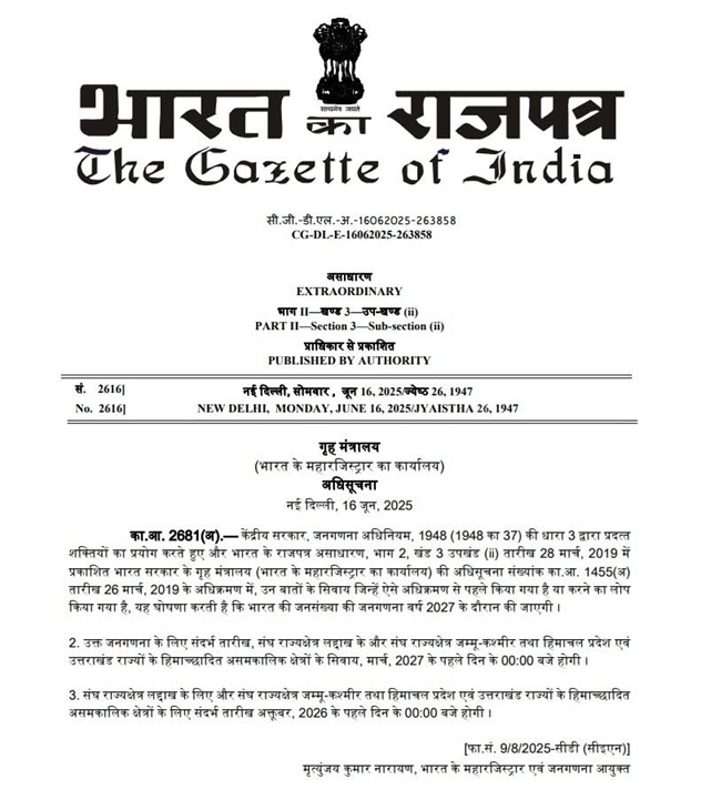 કેન્દ્રીય ગૃહ મંત્રાલય દ્વારા સોમવાર, 16 જૂનના રોજ જારી કરાયેલા સત્તાવાર ગેઝેટ નોટિફિકેશન મુજબ, ભારત સરકારે ઔપચારિક રીતે જાહેરાત કરી છે કે દેશની આગામી દશકિય વસ્તી ગણતરી વર્ષ 2027 માં હાથ ધરવામાં આવશે. ભારતના રજિસ્ટ્રાર જનરલ અને વસ્તી ગણતરી કમિશનરની કચેરી દ્વારા વસ્તી ગણતરી અધિનિયમ, 1948 હેઠળ જારી કરાયેલ સૂચના અનુસાર, વસ્તી ગણતરી માટે સંદર્ભ તારીખ 1 માર્ચ, 2027 ના રોજ 00:00 કલાક હશે. જો કે, અમુક બરફથી ઘેરાયેલા અને દૂરના પ્રદેશો માટે, સંદર્ભ તારીખ મોસમી સુલભતા સમસ્યાઓને ધ્યાનમાં રાખીને ગોઠવવામાં આવી છે.