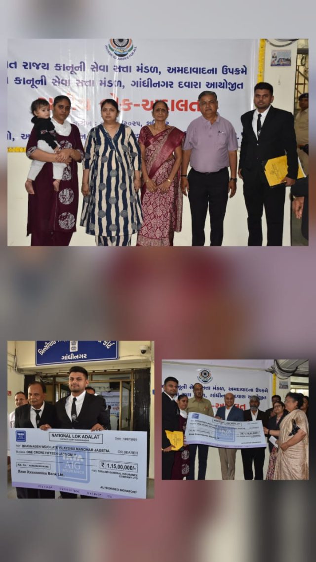 વાહન અકસ્માતના આ રીતના કેસોના નીકાલ માટે શનીવારે ગાંધીનગર સહીત દેશભરમાં રાષ્ટ્રીય લોક અદાલત યોજાઈ હતી. ત્યારે વર્ષ ૨૦૨૪ માં લીંબડીયા કેનાલ બ્રીજ પાસે ઉભેલી ટ્રકમાં કાર ઘુસી જતા ૩૫ વર્ષના યુવકનું મૃત્યુ થયુ હતુ. આ કેસમાં લોક અદાલતમાં બન્ને પક્ષોનું સમાધાન થયુ હતું. કેસના નીકાલના ભાગ રૂપે મૃતક વિજય જગેટીયાના પરીવારને હાઈકોર્ટ જસ્ટીસ ના હસ્તે રૂા. ૧.૧૫/-કરોડના વળતરનો ચેક આપવામાં આવ્યો હતો.