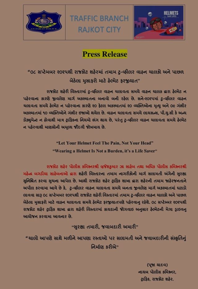 રાજકોટ ટ્રાફિક પોલીસે બાઇકચાલક અને પાછળ બેસનારે ફરજિયાત હેલ્મેટ પહેરવાને લઈને પ્રેસ રિલીઝ જાહેર કરી છે. પોલીસ કમિશ્નરે તહેવારના દિવસો પૂર્ણ થયા બાદ શહેરમાં હેલ્મેટને લઈને મેગા ડ્રાઇવ શરુ કરવાનો આદેશ કર્યો છે.