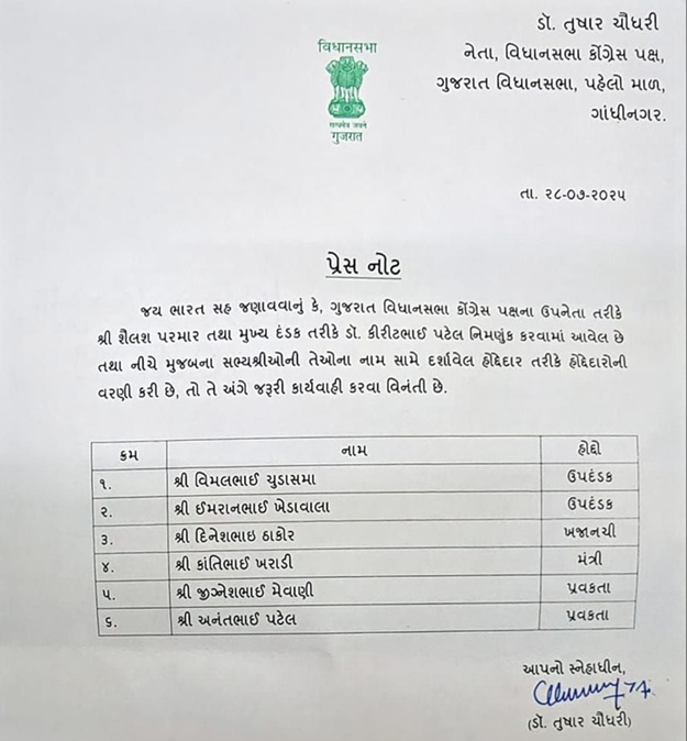 ગુજરાત કોંગ્રેસ દ્વારા શૈલેષ પરમારને કોંગ્રેસ પક્ષના ઉપનેતા અને ડૉ. કિરીટ પટેલને મુખ્ય દંડક તરીકેની જવાબદારી સોંપવામાં આવી છે. જેમાં જીગ્નેશ મેવાણી અને અનંત પટેલને પ્રવક્તા બનાવામાં આવ્યા છે. જ્યારે અન્ય નેતાઓને ઉપદંડક સહિતની જવાબદારી આપવામાં આવી છે.