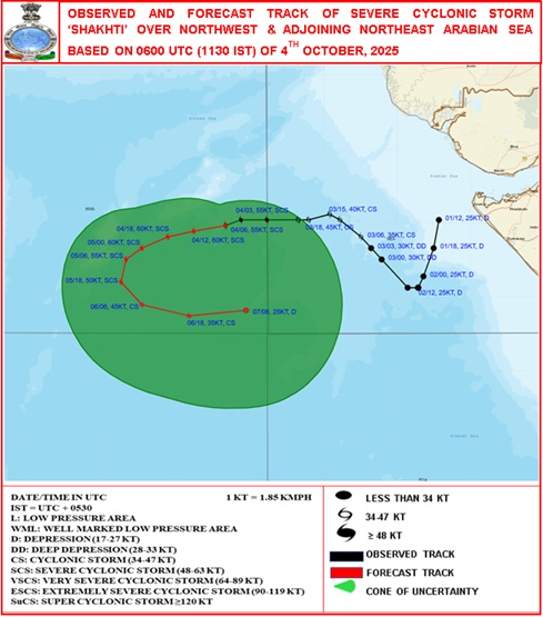હવામાન વિભાગ મુજબ, ‘શક્તિ’ વાવાઝોડાની અસરને લઈને આગામી 8-9 ઑક્ટોબરના રોજ સૌરાષ્ટ્ર અને દક્ષિણ ગુજરાતના વિસ્તારોમાં ભારે વરસાદ થવાની શક્યતા છે. જેમાં 8 ઑક્ટોબરે જામનગર, દેવભૂમિ દ્વારકા, પોરબંદર, સુરત, નવસારી, વલસાડ અને 9 ઑક્ટોબરે વલસાડ જિલ્લામાં ભારે વરસાદને લઈને હવામાન વિભાગે યલો ઍલર્ટ જાહેર કર્યું છે.