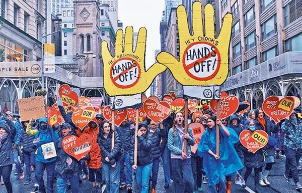બીજા કાર્યકાળમાં પણ સત્તા સંભાળ્યાના ત્રણ મહિનાથી ઓછા સમયમાં ટ્રમ્પ વિરુદ્ધ લોકોનો ગુસ્સો ફાટી નીકળ્યો છે. ટ્રમ્પ વિરુદ્ધના આંદોલનને ‘હેન્ડ્સ ઓફ’ નામ આપવા પાછળનો આશય એ સંદેશો પહોંચાડવાનો છે કે તેઓ લોકોની ખાનગી બાબતોમાં દખલ કરવાનું બંધ કરી દે.