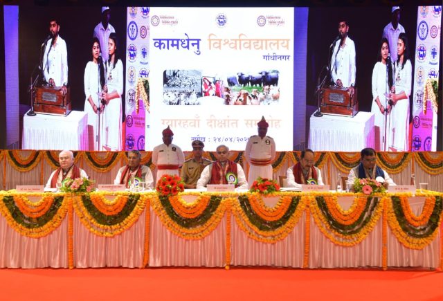 રાજ્યપાલ અને કુલાધિપતિ શ્રી આચાર્ય દેવવ્રતજીના અધ્યક્ષસ્થાને અને પશુપાલન મંત્રી શ્રી રાઘવજી પટેલની પ્રેરક ઉપસ્થિતિમાં ટાઉનહોલ-ગાંધીનગર ખાતે કામધેનુ યુનિવર્સિટીનો ૧૧મો દીક્ષાંત સમારોહ યોજાયો હતો. જેમાં ૭૪૨ વિદ્યાર્થીઓને પશુચિકિત્સા, ડેરી અને મત્સ્યપાલન શાખાઓના વિવિધ અભ્યાસક્રમોની પદવી એનાયત કરવામાં આવી હતી. આ ઉપરાંત રાજ્યપાલશ્રીના હસ્તે તેજસ્વી વિદ્યાર્થીઓને ૧૦૫ મેડલ પણ અર્પણ કરવામાં આવ્યા હતા.