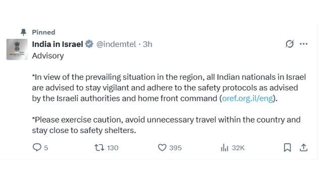 ઈરાનમાં પરમાણુ સુવિધાઓને નિશાન બનાવતા ઈઝરાયલના હવાઈ હુમલા પછી મધ્ય પૂર્વમાં વધી રહેલા તણાવ વચ્ચે, ભારતે તેના નાગરિકો અને ઈરાનમાં રહેતા ભારતીય મૂળના લોકોને સાવચેતી રાખવા માટે એક સલાહકાર જારી કર્યો છે.