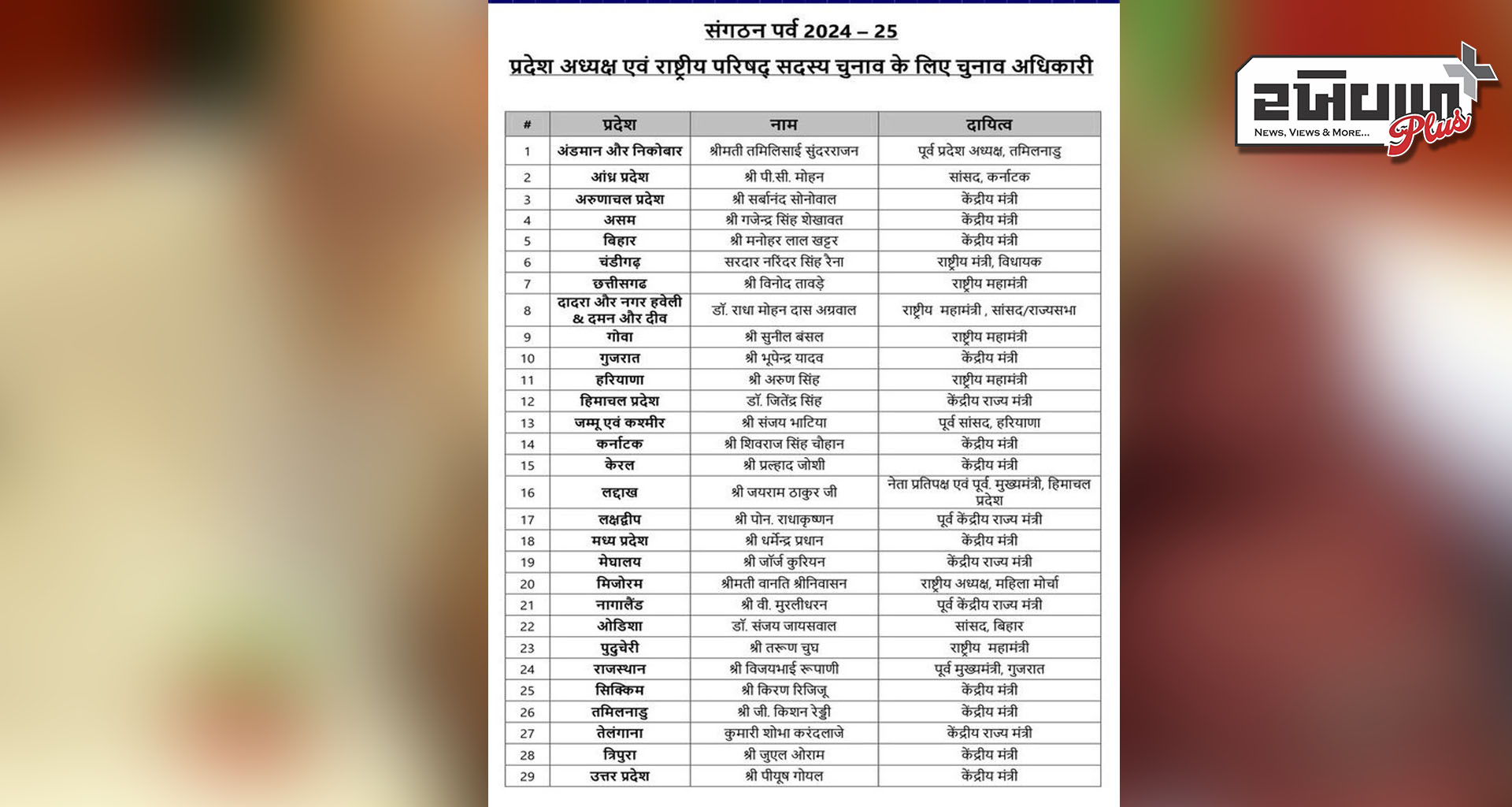 ચૂંટણી અધિકારીઓની આ યાદી પાર્ટીના રાષ્ટ્રીય ચૂંટણી અધિકારી ડૉ.કે.લક્ષ્મણે જાહેર કરી છે.ચૂંટણી અધિકારીઓની નિમણૂક કરવા માટે 29 ડિસેમ્બર 2024ના રોજ પાર્ટી અધ્યક્ષ જેપી નડ્ડાની અધ્યક્ષતામાં એક બેઠક યોજાઈ હતી. આ ક્રમમાં, રાજ્ય પ્રમુખો અને રાષ્ટ્રીય પરિષદના સભ્યોની ચૂંટણી માટે રાજ્ય અધિકારીઓની નિમણૂક કરવામાં આવી છે.