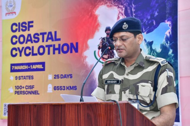 કેન્દ્રીય ઔદ્યોગિક સુરક્ષા દળ (સેન્ટ્રલ ઇન્ડસ્ટ્રિયલ સિક્યુરિટી ફોર્સ-CISF)ના 56માં સ્થાપના દિવસની ઉજવણીના ભાગરૂપે આયોજિત ‘ગ્રેટ ઈન્ડિયન કોસ્ટલ સાયક્લોથોન’ સુરત આવી પહોંચી હતી. CISFના જવાનોને પ્રોત્સાહન પૂરૂ પાડવા અને રાષ્ટ્રસુરક્ષા માટે તેમના યોગદાનને બિરદાવવા માટે ગુજરાતના કચ્છના લખપતથી ‘ગ્રેટ ઈન્ડિયન કોસ્ટલ સાયક્લોથોન’ને સુરતના ડાયમંડ બ્રુર્સ ખાતે પોલીસ કમિશનર અનુપમસિંહ ગહલૌતે ફ્લેગ ઓફ આપી પ્રસ્થાન કરાવ્યું હતું. ઉપરાંત, સુરત ખાતે ગ્રીન ઓર્કિડ ફાર્મમાં સંયુક્ત સાંસ્કૃતિક કાર્યક્રમ યોજાયો હતો. ધનંજય નાઈક, CISF સિનિયર કમાન્ડન્ટ કપિલ વર્મન, CISF સિનિયર કમાન્ડન્ટ કુમાર અભિષેક, CASO ASG સુરત કમાન્ડન્ટ સુરેન્દ્ર સોનકરિયા સહિત અધિકારીઓ આ પ્રસંગે ઉપસ્થિત રહ્યા હતા.