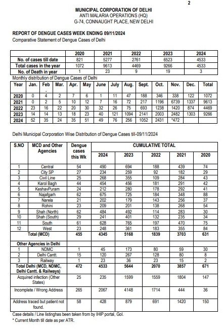 રાષ્ટ્રીય રાજધાની દિલ્હીમાં ડેન્ગ્યુના કેસોની સંખ્યા સતત વધી રહી છે. છેલ્લા એક સપ્તાહમાં ડેન્ગ્યુના 472 કેસ નોંધાયા છે. આ વર્ષે પણ ડેન્ગ્યુના કારણે અત્યાર સુધીમાં 3 લોકોના મોત થયા છે. આ વર્ષે અત્યાર સુધીમાં કુલ 4533 કેસ નોંધાયા છે. આ જાણકારી દિલ્હી મ્યુનિસિપલ કોર્પોરેશન દ્વારા આપવામાં આવી છે.