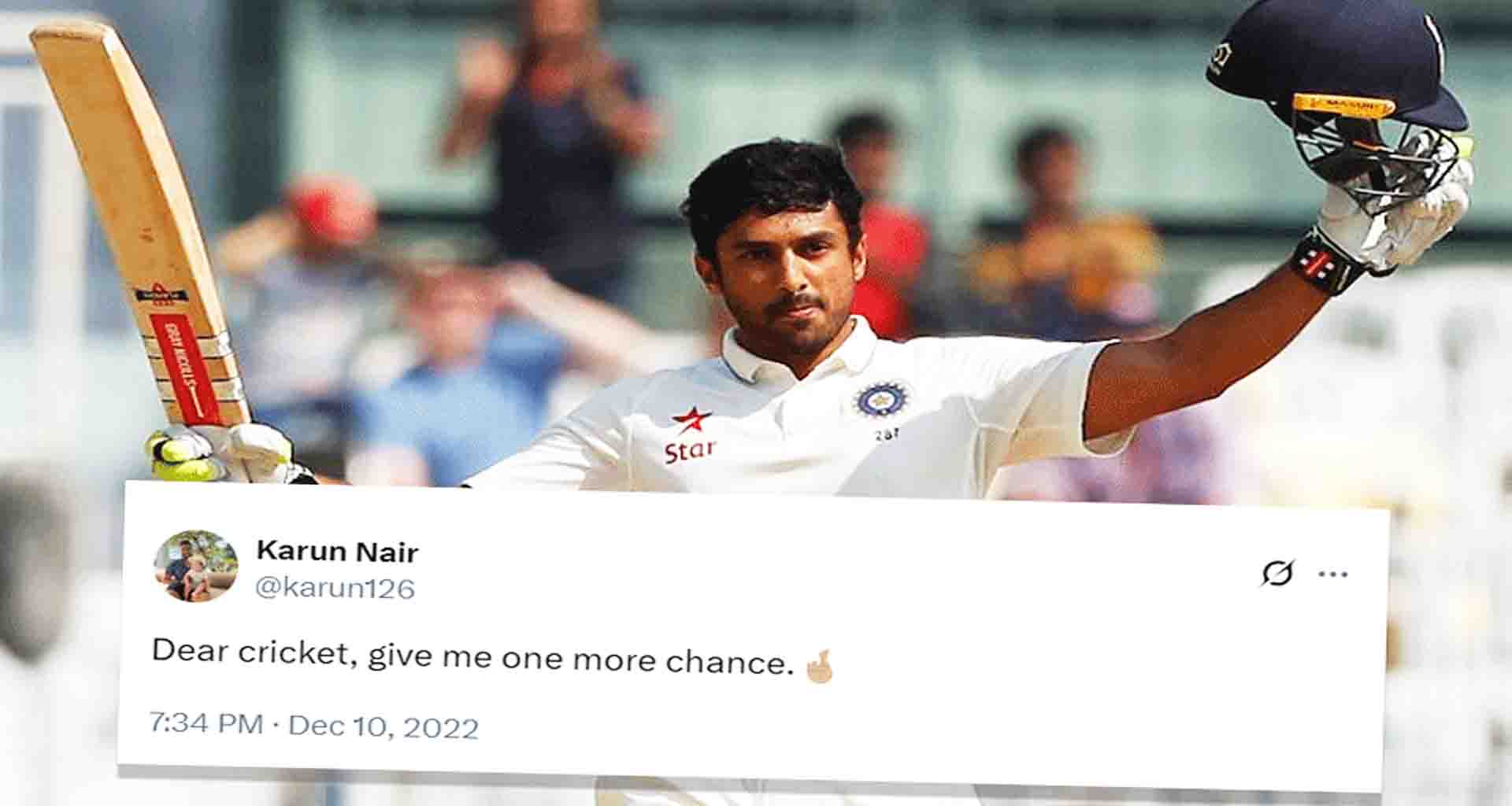 કરુણ નાયર હજુ સુધી ટેસ્ટમાં અડધી સદી ફટકારી શક્યો નથી; કરુણ નાયરે 2016 માં ભારતીય ટેસ્ટ ટીમ માટે ડેબ્યૂ કર્યું હતું. આ પછી, તેણે ઇંગ્લેન્ડ સામે ત્રેવડી સદી ફટકારી, જે આજ સુધી ટેસ્ટમાં તેના નામે નોંધાયેલ એકમાત્ર સદી છે. તેના ખરાબ પ્રદર્શનનો અંદાજ એ હકીકત પરથી લગાવી શકાય છે કે તેની એકમાત્ર સદી સિવાય, તે હજુ સુધી ટેસ્ટમાં 50 રનનો સ્કોર પાર કરી શક્યો નથી.