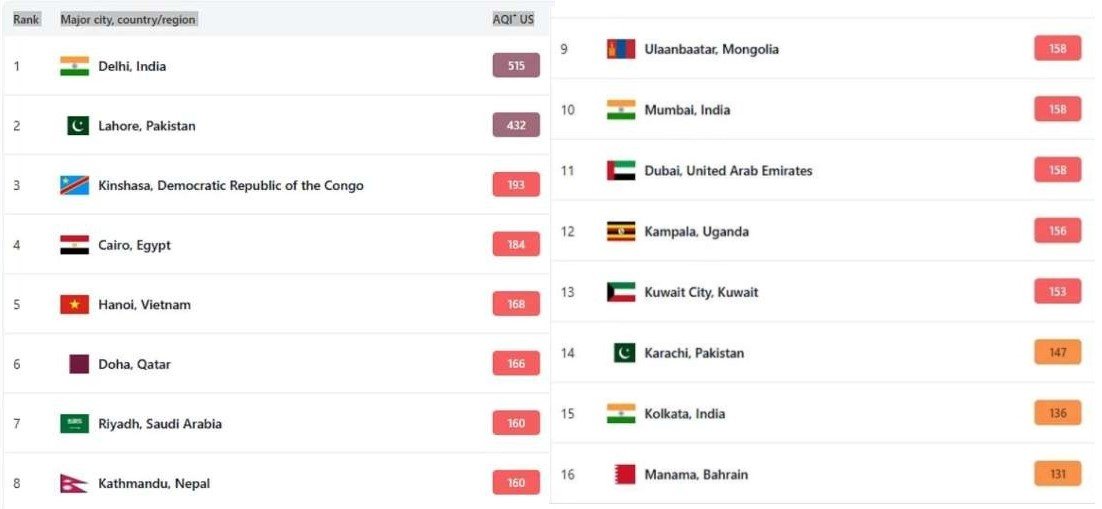 નેપાળની રાજધાની કાઠમંડુ રેન્કિંગ યાદીમાં 8મા સ્થાને છે, અહીં AQI સ્તર 160 નોંધાયું હતું. નવમા ક્રમે મંગોલિયાનું ઉલાનબાતાર શહેર 158 AQI સ્તર સાથે છે. જ્યારે મુંબઈ શહેર 158ના AQI સાથે 10મા ક્રમે છે. તે પછી કોલકાતા આવે છે, જ્યાં AQI 136 રેકોર્ડ કરવામાં આવ્યો હતો.