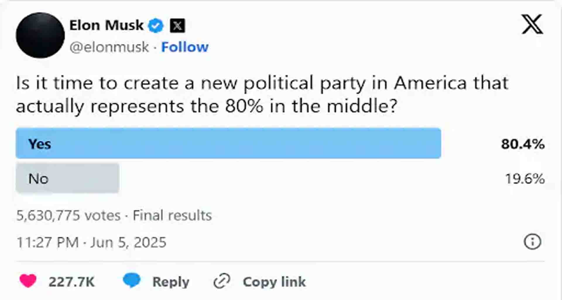મસ્કે ટ્વિટ કર્યું; એલોન મસ્કે ટ્વિટર હેન્ડલ પર એક પોલમાં પૂછ્યું હતું કે શું અમેરિકાને નવા રાજકીય પક્ષની જરૂર છે. તેમના મતદાનમાં 56 લાખથી વધુ લોકોએ ભાગ લીધો હતો અને 80% લોકોએ કહ્યું હતું કે હા, એક નવી પાર્ટીની જરૂર છે. હવે મસ્કે મતદાનનું પરિણામ શેર કર્યું અને લખ્યું, "લોકોએ પોતાનો અભિપ્રાય આપ્યો છે. અમેરિકાને એક નવી પાર્ટીની જરૂર છે જે 80% લોકોનો અવાજ બને." એલોન મસ્કે લોકોના મતદાનનો જવાબ આપતા લખ્યું, 'ધ અમેરિકા પાર્ટી'