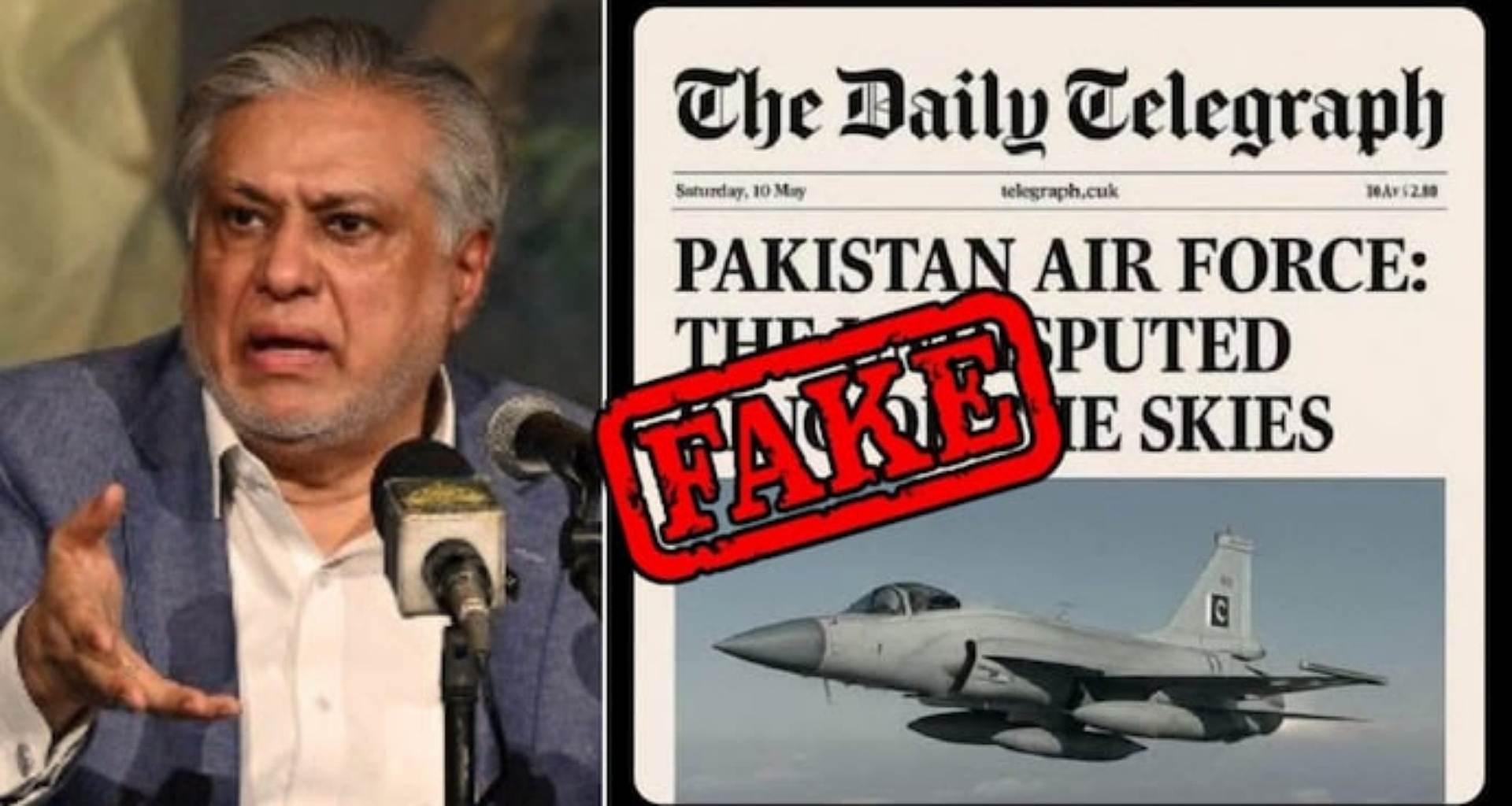 પાકિસ્તાન ભારતીય ઉપખંડમાં લોકકથાઓમાંથી પસાર થતી સદીઓ જૂની શાણપણ ભૂલી ગયું હોય તેવું લાગે છે - બીજાઓ માટે ખાડો ખોદો, અને પોતાને તેમાં પડતા જુઓ. પાકિસ્તાનના નાયબ વડા પ્રધાન ઇશાક ડારે, ભારત-પાકિસ્તાન અથડામણ પર પાકિસ્તાની સેનેટમાં ભાષણ દરમિયાન, ઇસ્લામાબાદ-રાવલપિંડી સ્થાપના અને તેના ગુંડાઓ દ્વારા પ્રસારિત કરાયેલા એક નકલી સમાચાર અહેવાલનો ઉલ્લેખ કર્યો. ઈજા પર અપમાન ઉમેરવા માટે, ડારના નકલી અહેવાલના સંદર્ભની પાકિસ્તાની મીડિયા દ્વારા જ હકીકત-તપાસ કરવામાં આવી હતી. પાકિસ્તાની સૈન્યની પ્રશંસા કરતી વખતે, ઇશાક ડાર, જે વિદેશ મંત્રી પણ છે, તેમણે 15 મેના રોજ કહ્યું હતું કે, ટેલિગ્રાફ લખે છે કે, પાકિસ્તાન વાયુસેના આકાશનો નિર્વિવાદ રાજા છે. દાર ધ ડેઇલી ટેલિગ્રાફના ફોટોશોપ કરેલા ફ્રન્ટ પેજનો ઉલ્લેખ કરી રહ્યા હતા, જેની હેડલાઇનમાં લખ્યું હતું, 'પાકિસ્તાન વાયુસેના: આકાશનો નિર્વિવાદ રાજા' જેમાં પાકિસ્તાન વાયુસેના (PAF) ના JF-17 થંડરનો ફોટો હતો. પેજના માસ્ટહેડ પર તારીખ 10 મે લખેલી છે. જોકે, 10 મેના ધ ડેઇલી ટેલિગ્રાફના મૂળ ફ્રન્ટ પેજ પર નૌકાદળના વડાએ 'જુનિયર સાથેના અફેર પર' હેડલાઇન લખી હતી. પાકિસ્તાન અથવા તેના PAF બ્રિટિશ દૈનિકના ફ્રન્ટ પેજ પર ડાયજેસ્ટ આઇટમ તરીકે પણ દર્શાવવામાં આવ્યા ન હતા. 10 મેથી, પાકિસ્તાની હેન્ડલ્સ PAFનો મહિમા કરતી એક છબી શેર કરી રહ્યા છે અને એક બ્લુ-ટિક X હેન્ડલ પણ જે પાકિસ્તાનના મુખ્ય લશ્કરી પ્રવક્તા, ઇન્ટર-સર્વિસિસ પબ્લિક રિલેશન્સ (ISPR) ના ડાયરેક્ટર જનરલ લેફ્ટનન્ટ જનરલ અહેમદ શરીફ ચૌધરીની ખોટી માહિતીને વધારવા માટે પોસ્ટ કરવામાં આવ્યું હતું.