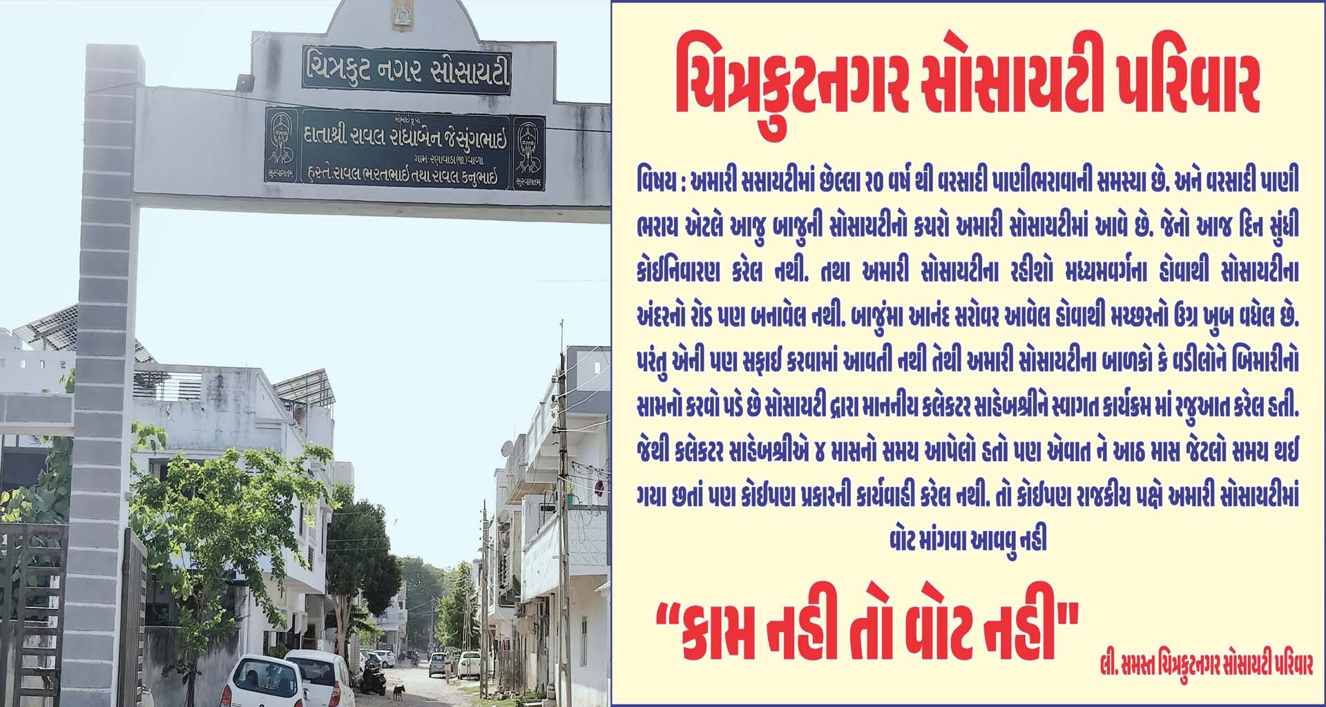 ચિત્રકૂટ સોસાયટી પરિવાર દ્વારા લગાવેલ બેનરમાં ઉલ્લેખ કર્યો છે કે, અમારી સસાયટીમાં છેલ્લા 20 વર્ષ થી વરસાદી પાણી ભરાવાની સમસ્યા છે. અને વરસાદી પાણી ભરાય એટલે આજુબાજુની સોસાયટીનો કચરો અમારી સોસાયટીમાં આવે છે. જેનું આજદિન સુંધી કોઈ નિવારણ કરેલ નથી. તથા અમારી સોસાયટીના રહીશો મધ્યમવર્ગના હોવાથી સોસાયટીના અંદરનો રોડ પણ બનાવેલ નથી. બાજુમા આનંદ સરોવરઆવેલ હોવાથી મચ્છરનો ઉપદ્રવ પણ ખુબ વધેલ છે. પરંતુ એની પણ સફાઈ કરવામાં આવતી નથી તેથી અમારી સોસાયટીના બાળકો કે વડીલોને બિમારીનો સામનો કરવો પડે છે.