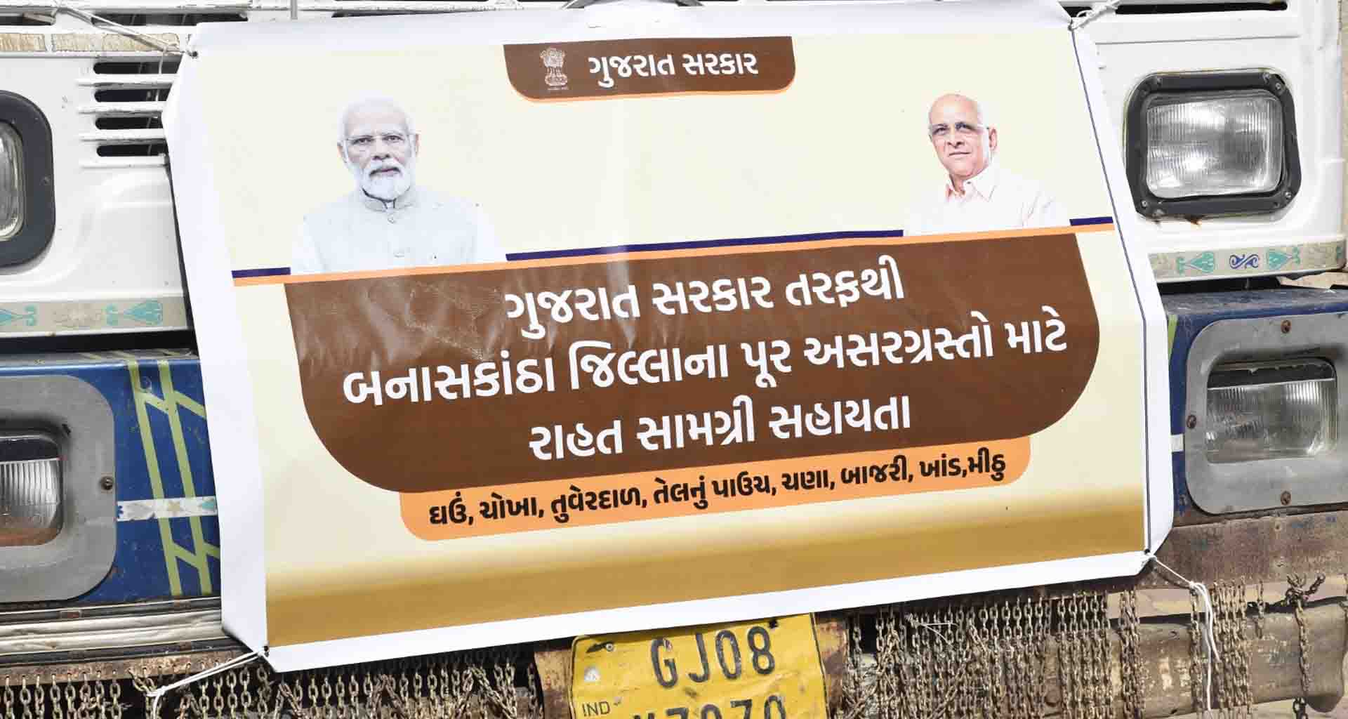 આજરોજ બનાસકાંઠાના મુખ્ય મથક પાલનપુર ખાતેથી રાજ્ય સરકારના મંત્રી જગદીશભાઈ વિશ્વકર્માએ પુરગ્રસ્ત વિસ્તાર માટેની રાશન કીટનું પ્રસ્થાન કરાવ્યું હતું. ૧૫ કિલોની ૧ કીટ એમ કુલ ૧૮૦૦૦ કીટ સરહદી તાલુકાઓમાં અસરગ્રસ્ત વિસ્તારના લોકો માટે વિતરણ કરાશે. ૧૫ કિલોની રાશન કીટમાં ૫ કિલો ઘઉં, ૩ કિલો બાજરી, ૨ કિલો ચોખા, ૧ કિલો ખાંડ, ૧ કિલો તુવેરદાળ, ૧ કિલો ચણા, ૧ કિલો મીઠું અને ૧ લીટર તેલનો સમાવેશ થાય છે.