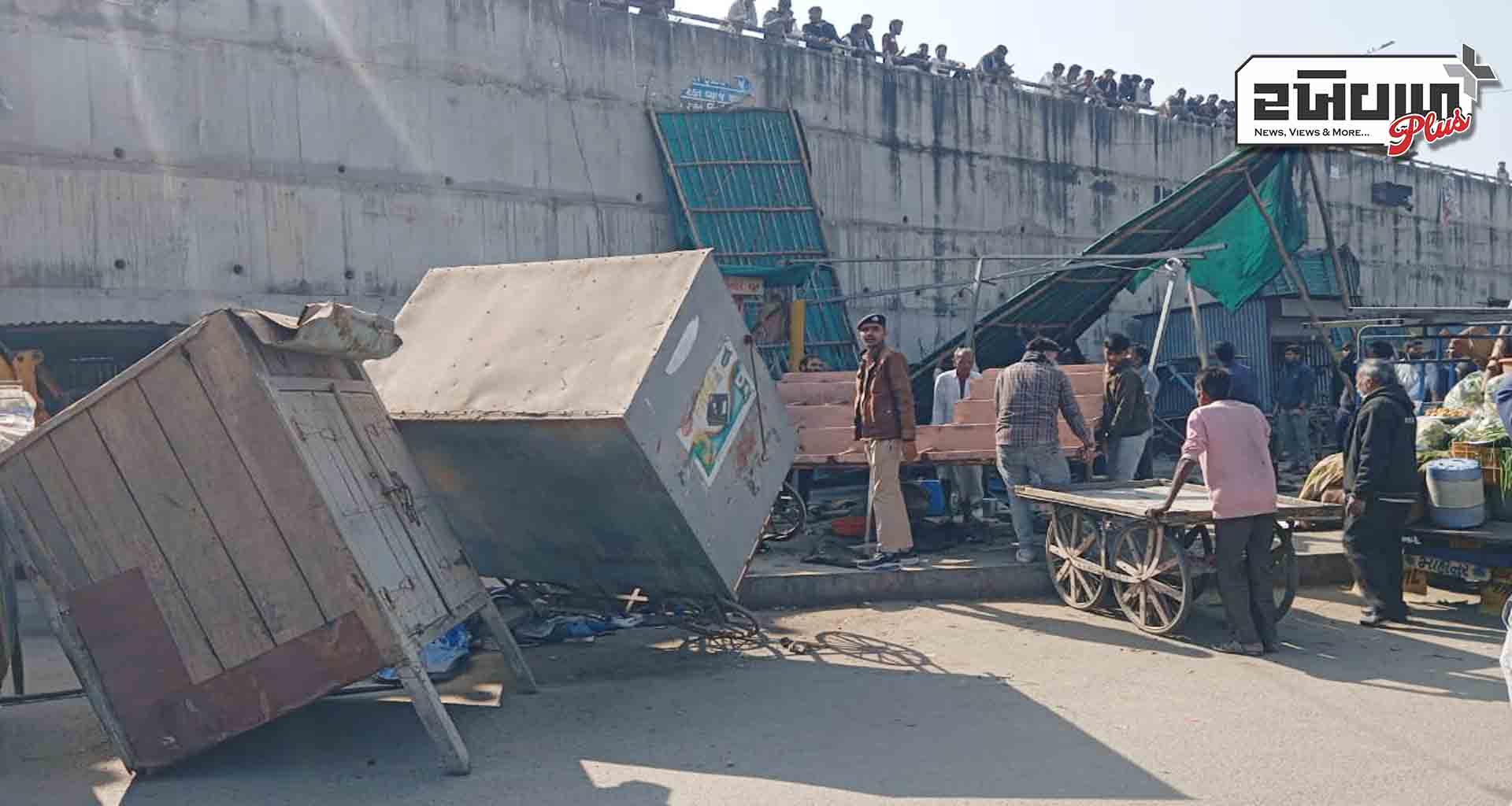 પાકી દુકાનોના દબાણ ગ્રસ્ત છજ્જા- છાપરા ઓટલા સીડી દૂર કરાયા: સમગ્ર ગુજરાતમાં દબાણ હટાવવાની કામગીરી હાથ ધરવામાં આવી રહી છે. ત્યારે કાંકરેજ તાલુકાના થરા નગરપાલિકા વિસ્તારમાંથી નેશનલ હાઇવે નં.૨૭ પસાર થાય છે. અહીં નેશનલ હાઇવે ઓથોરિટી દ્વારા એક કીમી લાંબો ઓવર બ્રિજ બે થી એકવીસ ફુટ ઉંચો બનાવી બંને બાજુ નગર વિસ્તારમાં અવરજવર માટે ફૂટપાથ સાથે સર્વિસરોડ બનાવવામાં આવેલ છે આ ફૂટપાથ પર લોકોએ કેબીન ગલ્લા છાપરાના દબાણ કરી પોતાનો ધંધો કે એ દબાણ કરેલ જગ્યા ભાડે આપી ફૂટપાથ પર જમાવટ કરતાં અને રખડતા ઢોરોને કારણે થરા વેપારી શૈક્ષણિક મથક હોવાથી ટ્રાફિકની વિકટ સમસ્યા જોવા મળતી હતી.