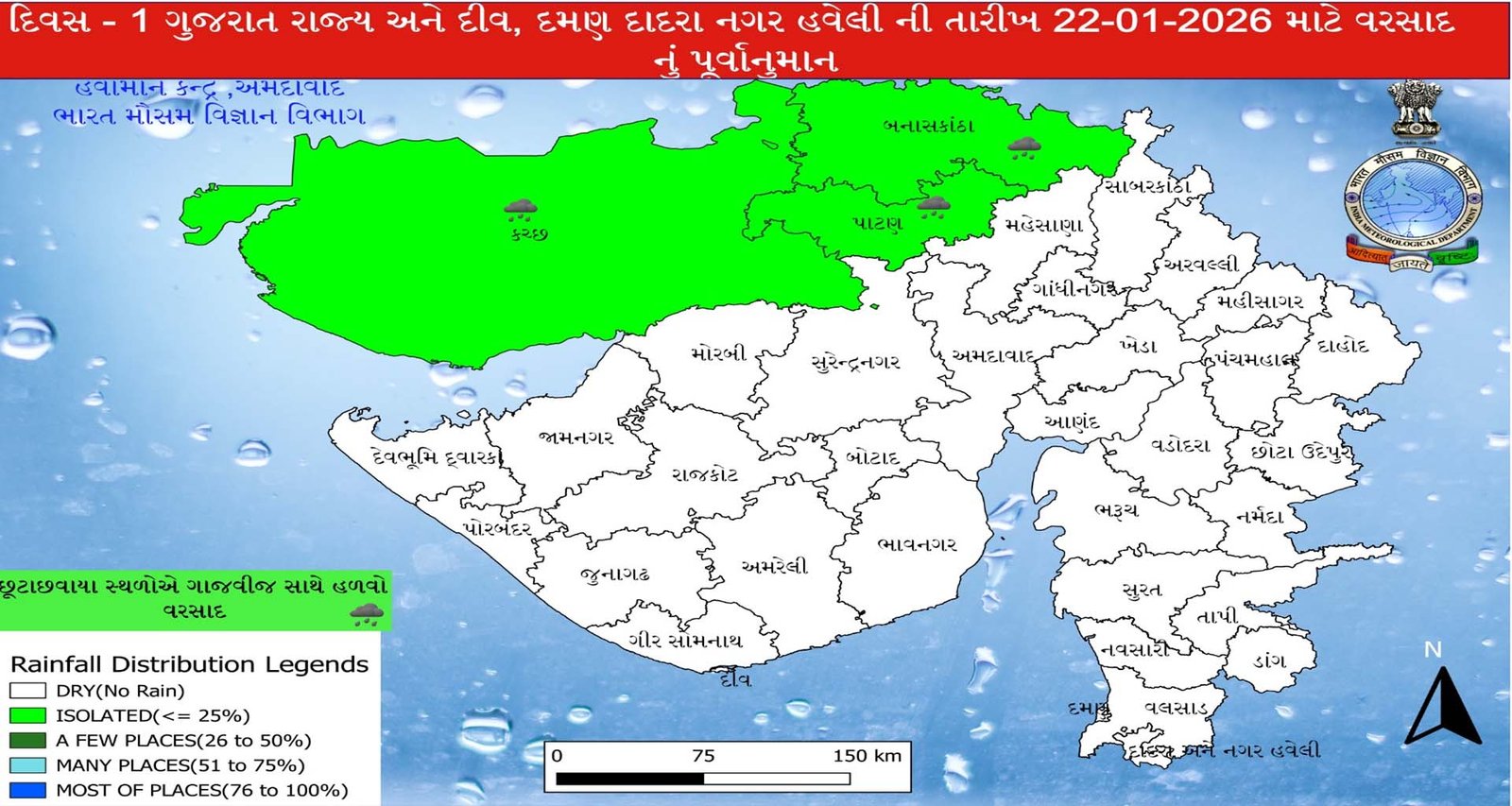 વેસ્ટર્ન ડિસ્ટર્બન્સના કારણે ઉત્તર ગુજરાતના કચ્છ, બનાસકાંઠા અને પાટણ જિલ્લાઓમાં ગાજવીજ સાથે કમોસમી વરસાદની આગાહી કરવામાં આવી છે. હવામાન વિભાગ દ્વારા એલર્ટ જાહેર કરવામાં આવતા ખેડૂત વર્ગમાં પણ ચિંતા વધી છે.