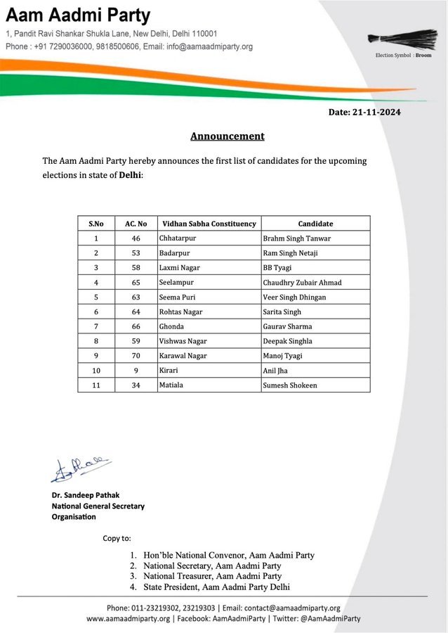 આમ આદમી પાર્ટીએ ઉમેદવારોની પ્રથમ યાદી જાહેર કરી 11 ઉમેદવારોના નામ