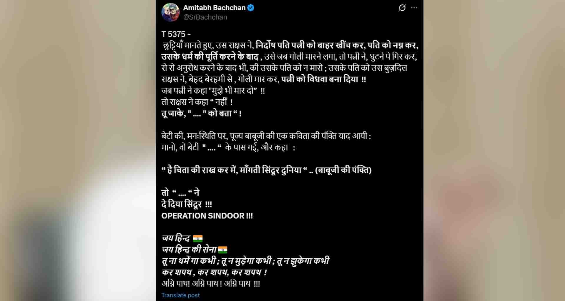 અમિતાભ બચ્ચને પહેલગામ હુમલામાં માર્યા ગયેલા નિર્દોષ લોકો અને ભારતીય સેના દ્વારા હાથ ધરવામાં આવેલા ઓપરેશન સિંદૂર પર સોશિયલ મીડિયા દ્વારા પોતાની પ્રતિક્રિયા આપી. પોતાની પોસ્ટમાં, તેમણે આતંકવાદીઓને કાયર અને રાક્ષસો કહ્યા અને હુમલામાં માર્યા ગયેલા નિર્દોષ લોકો પ્રત્યે સંવેદના વ્યક્ત કરી અને તે જ સમયે ઓપરેશન સિંદૂરની પ્રશંસા કરી. તેમણે પોતાના હૃદયની લાગણીઓ કવિતા દ્વારા વ્યક્ત કરી.અમિતાભ બચ્ચને પોસ્ટ શેર કરી; હૃદયની લાગણીઓ કવિતા દ્વારા વ્યક્ત કરી