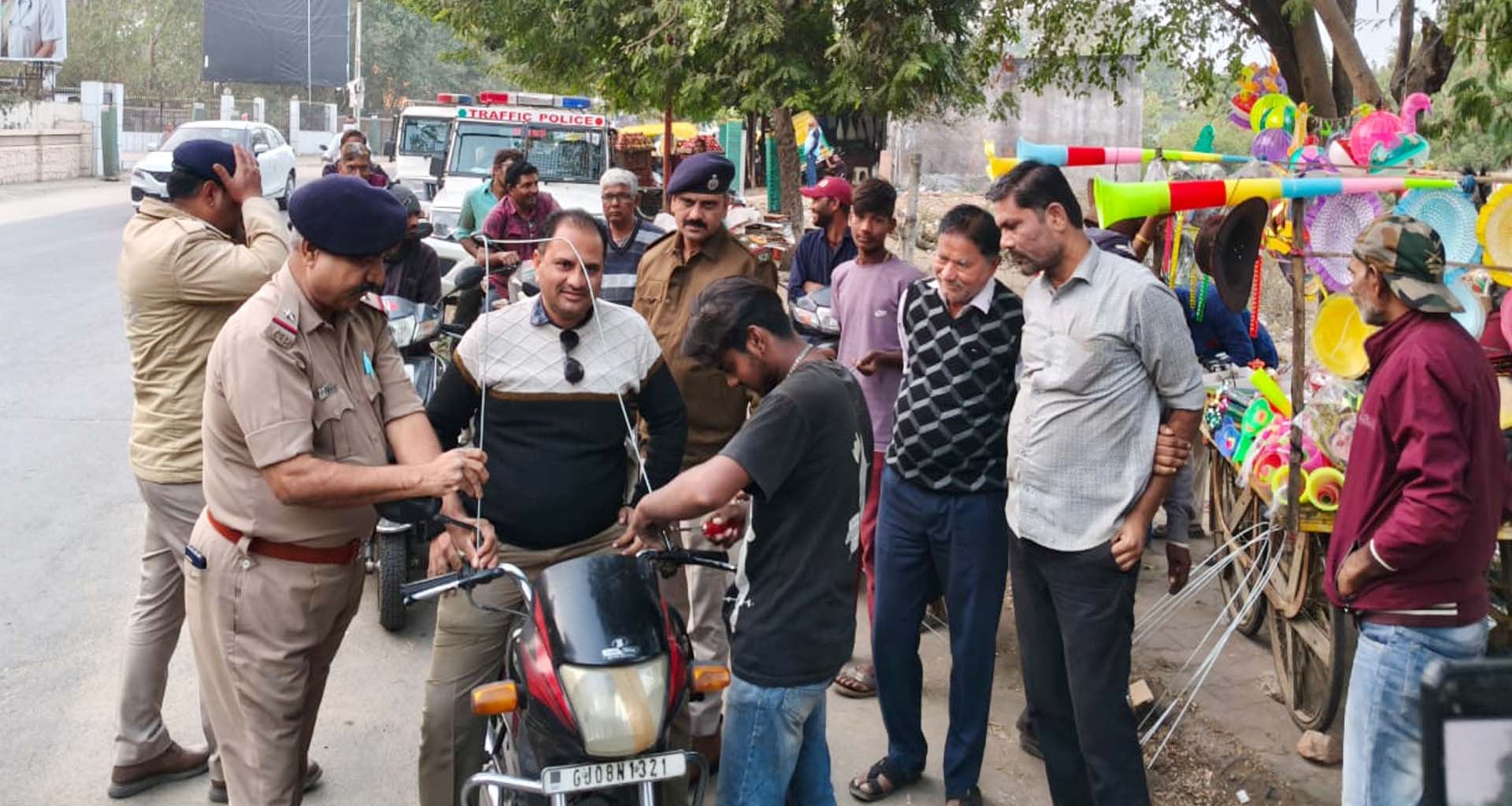 ગુજરાતમાં માર્ગ સુરક્ષા માસની ઉજવણીમાં રોડ ઉપર સર્જાતા અકસ્માતો ને અટકાવવા અને વાહન તાલુકો જનજાગૃતિ લાવવા માટે વિવિધ કાર્યક્રમો કરવામાં આવી રહ્યા છે. ત્યારે ઉત્તરાયણના પર્વમાં પતંગના દોરીથી દ્વિ-ચક્રીય વાહન ચાલકોના ગળા કપાઈ જવાના કિસ્સાઓ બનતા હોય છે જેને લઈને બનાસકાંઠા જિલ્લા ટ્રાફિક પોલીસ ઇન્સ્પેક્ટર એ.વી.જાડેજા અને પાલનપુર શહેર ટ્રાફિક પી.એસ.આઇ એચ.પી. દેસાઈની ટીમે પાલનપુર શહેરમાં દ્વિ-ચક્રીય વાહન ચાલકોને પતંગની દોરીથી બચાવ માટે તેમના વાહનના આગલા ભાગે સેફ્ટીગાર્ડ લગાવી આપ્યા હતા. અને વાહન ચાલકોને યોગ્ય રીતે હેલ્મેટ પહેરી વાહન ચલાવવું અને ટ્રાફિકના નિયમોનું પાલન કરવા માટે સૂચન કરવામાં આવ્યા હતા.
