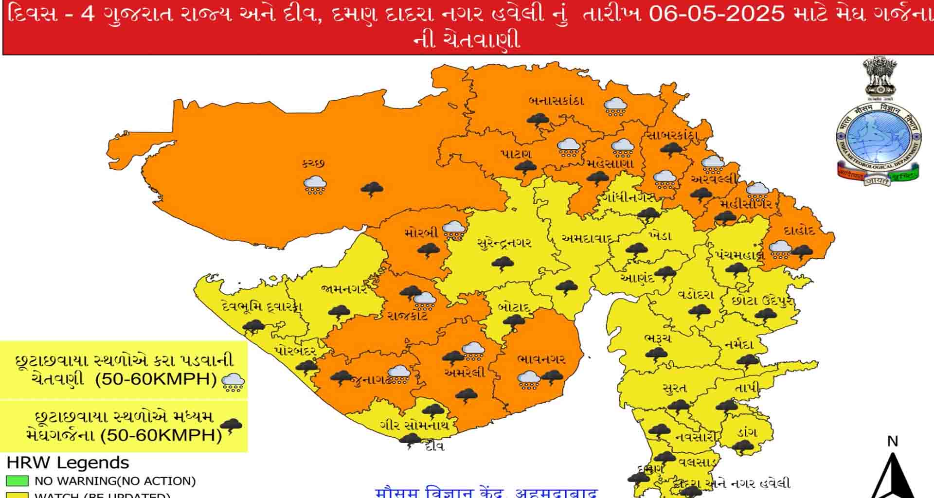 ગુજરાતમાં કાળઝાળ ગરમી પડી રહી છે. હવામાન વિભાગે આઠમી મે, 2025 સુધી કચ્છ-સૌરાષ્ટ્ર, ઉત્તર ગુજરાત સહિત રાજ્યના મોટાભાગના જિલ્લાના છૂટાછવાયા સ્થળોએ ગાજવીજ સાથે ભારે કમોસમી વરસાદની આગાહી કરવામાં આવી છે. આ દરમિયાન રાજ્યના કેટલાક જિલ્લાઓમાં રવિવારે વહેલી સવારથી વાતાવરણમાં પલટો આવ્યો હતો.