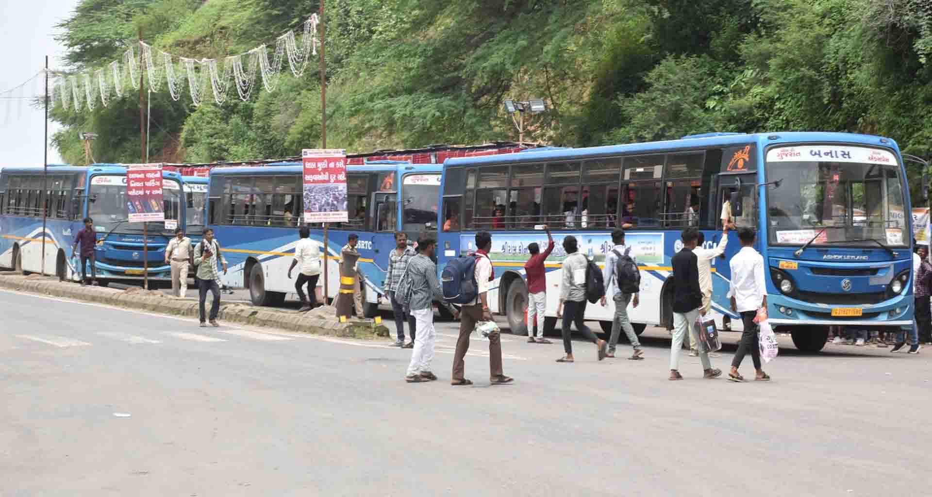 વિશ્વ પ્રસિદ્ધ યાત્રાધામ અંબાજી ખાતે ભાદરવી પૂનમના મહામેળાની શાનદાર જમાવટ થઇ રહી છે. માઈભક્તો પગપાળા માં અંબાના દર્શન માટે આવી રહ્યા છે, તો ઘણા શ્રદ્ધાળુઓ ગુજરાત એસ. ટી. નિગમની બસ મારફતે પણ અંબાજી આવી રહ્યા છે. અંબાજી આવતા મોટાભાગના લોકો પરત પોતાના ઘરે ગુજરાત એસ. ટી. નિગમની બસોમાં પ્રવાસ કરીને જાય છે. દૂર સુદૂરથી આવતા યાત્રાળુઓની સેવામાં ગુજરાત રાજ્ય વાહન વ્યવહાર નિગમ દ્વારા અંદાજિત 5500 જેટલી બસો મુકવામાં આવી છે. યાત્રાળુઓની સેવામાં કાર્યરત આ બસ સેવાનો લાભ લઈ યાત્રિકો રાજ્ય સરકાર અને વહીવટી તંત્રની કામગીરીને બિરદાવી રહ્યા છે અને તે સેવાનો અવિરત લાભ લઈ રહ્યા છે.