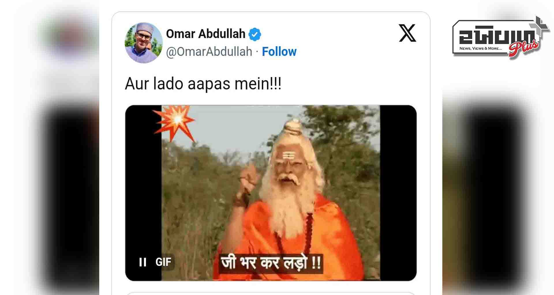 આપ અને કોંગ્રેસને ઓમર અબ્દુલ્લાનો સંદેશ; ઓમર અબ્દુલ્લા દ્વારા શેર કરાયેલ GIF પોસ્ટ મહાભારત સિરિયલની એક ટૂંકી ક્લિપ છે જેમાં એક ઋષિ કહે છે, "વધુ લડો, તમારા હૃદયની શાંતિ સુધી લડો, એકબીજાને મારી નાખો." તે આ કહેતો જોવા મળે છે. GIF ના ટેક્સ્ટમાં પણ આ જ વાત લખેલી છે. આ સંદેશને ઓમર અબ્દુલ્લાએ પોતાની પોસ્ટમાં રેખાંકિત કર્યો છે.