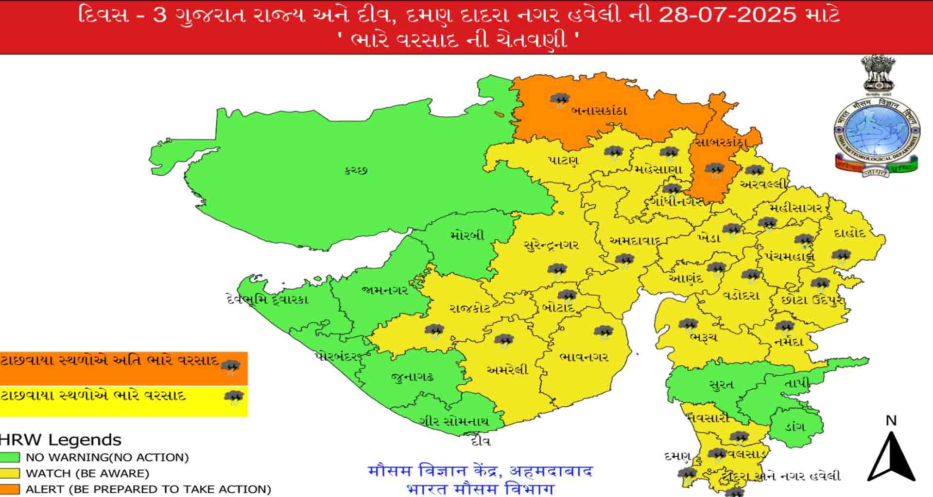 ભારતીય હવામાન વિભાગની માહિતી અનુસાર, 26 જૂલાઇ થી 31 જુલાઇ દરમિયાન રાજ્યના વિવિધ વિસ્તારોમાં વરસાદનું જોર વધશે ત્યારે રાજ્યમાં 11 જિલ્લાઓમાં ઓરેન્જ એલર્ટ અને ભારે વરસાદની આગાહી છે આ ઉપરાંત ત્રણ જિલ્લાઓમાં રેડ એલર્ટ પણ આપવામાં આવ્યું છે. છેલ્લા કેટલાક દિવસોથી વરસાદે વિરામ લીધો હતો પરંતુ બંગાળની ખાડીમાં સર્જાયેલી વરસાદી સિસ્ટમ ઉત્તર પશ્ચિમ દિશા તરફ આગળ વધતા ઉત્તર ગુજરાતમાં ફરી એકવાર આજથી વરસાદનું જોર વધવાની શક્યતાઓ દર્શાવવામાં આવી છે.બનાસકાંઠા27 જુલાઈ, 2025