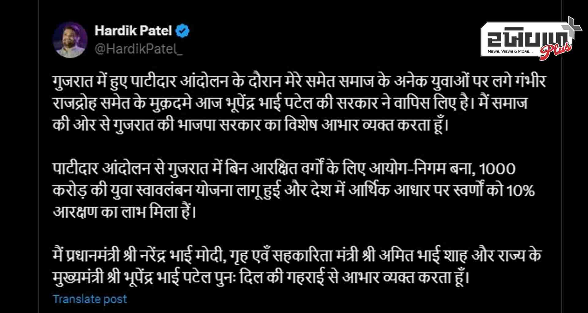 પાટીદાર અનામત આંદોલન દરમિયાન થયેલા રાષ્ટ્રદ્રોહ સહિતના કેસો રાજ્ય સરકારે પરત લીધા હોવાને લઇને આભાર માનતી સોશિયલ મીડિયા પોસ્ટ હાર્દિક પટેલે કરી છે. આ પોસ્ટ બાદ અન્ય પાટીદાર નેતાઓ અલ્પેશ કથીરિયા, દિનેશ બાંભણિયા અને નરેશ પટેલે પણ સરકારનો આભાર માન્યો છે. પણ આ મામલે કોંગ્રેસના પૂર્વ ધારાસભ્ય અને પાટીદાર આગેવાન લલિત કગથરાએ ચાબખા મારતા કહ્યું કે ‘ભાજપમાં ભળ્યા એટલે રાષ્ટ્રદ્રોહીમાંથી રાષ્ટ્રભક્ત થઇ જાય?’ તો લાલજી પટેલે કહ્યું કે ન માત્ર આ જ પણ તમામ કેસો પરત ખેંચવા જોઇએ. જોકે આ બાબતે સરકાર દ્વારા હજુ સુધી કોઇ સ્પષ્ટતા કરવામાં આવી નથી.